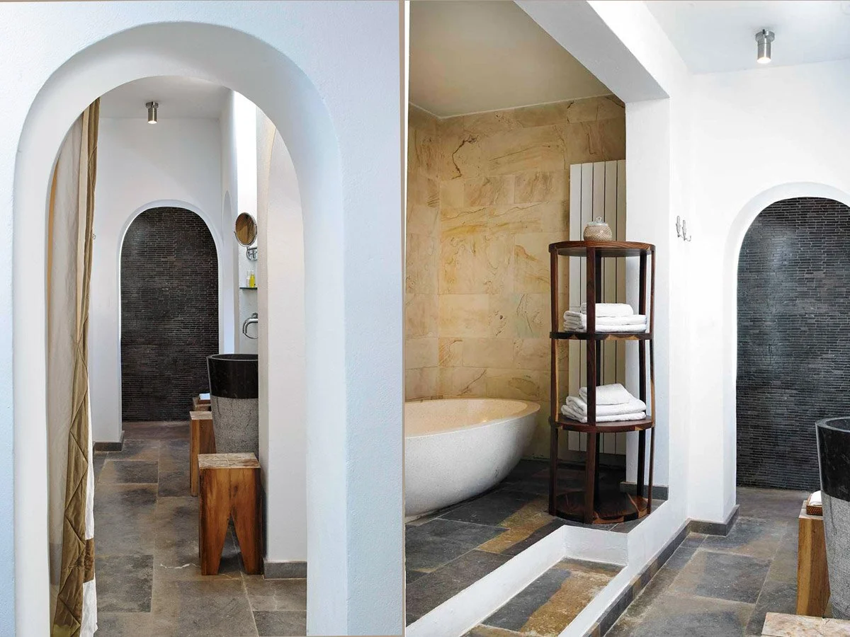 Traditional Ibiza elements including wooden beam ceilings and stone walls
